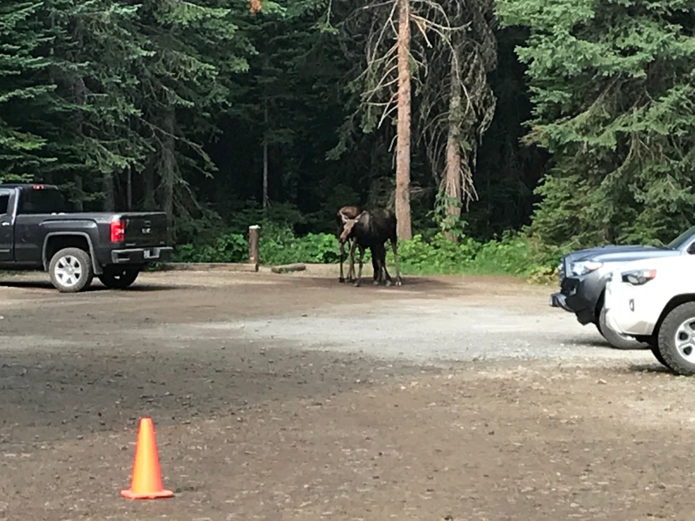 All over the Lodge there were warnings about an aggressive mother moose, accompanied by her two calves. And just to bring home the point, when I had gone into the parking lot to grab my walking stick that morning, there were the calves, banded together like a gangly, awkward teenage gang, lollygagging in the parking lot. There were some curious folks between my vehicle and the calves, so I grabbed my stick, snapped a shot from where I stood, and then headed back to reception to tell them the animals at large were right in their parking lot. The reception area was quite full, and as I said, “the two moose calves are in the parking lot”, people’s eyes lit up as they ran out to see. I went the opposite direction.